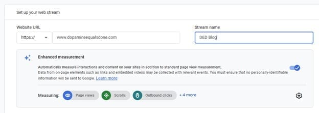 First I set up a new Google Analytics 4 (GA4) account, using the Google Workspace that I set up for MichelleLiggitt.com. That took about 5 minutes, though I admit I didn’t read the entire user agreement in that time. 😆 Then I set this domain up as my first property, as Google steps you through this the first time you create a GA4 account.